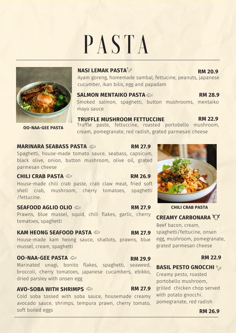 For the pasta enthusiasts, the Nasi Lemak Pasta stands out, marrying traditional Malaysian flavors with Italian cuisine. Meanwhile, the Truffle Mushroom Fettuccine showcases luxurious ingredients, offering a decadent experience.